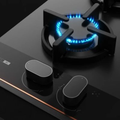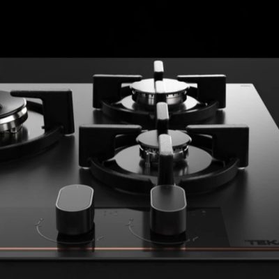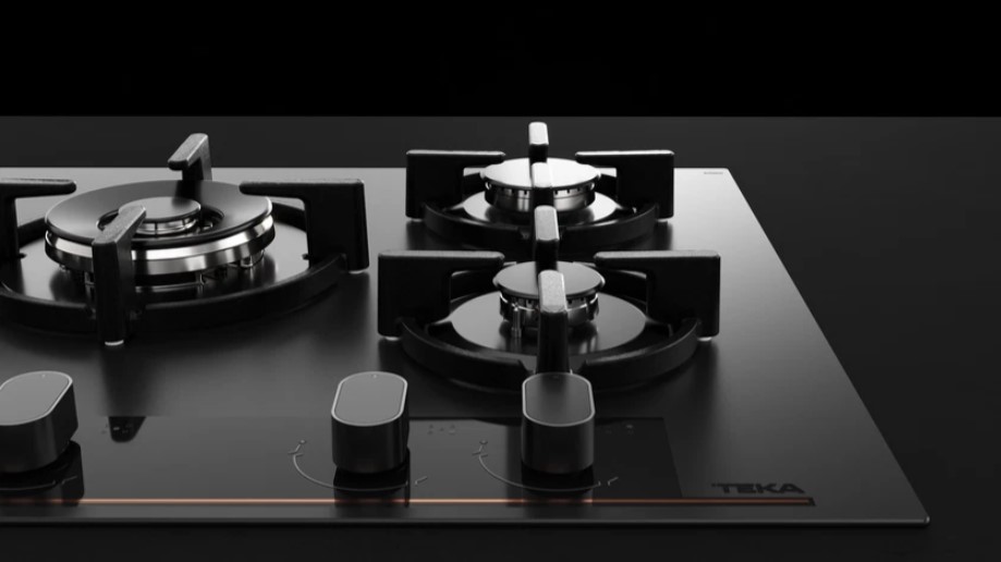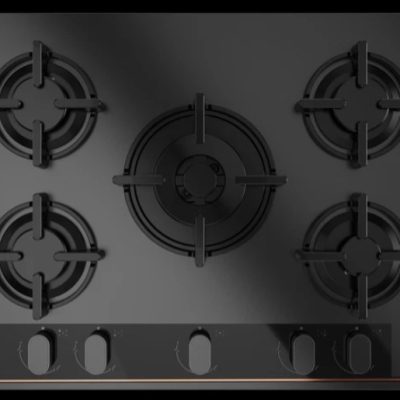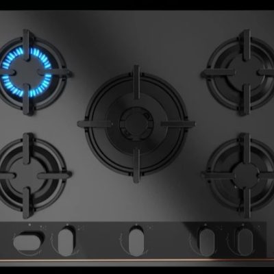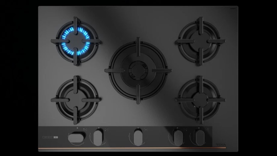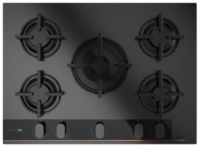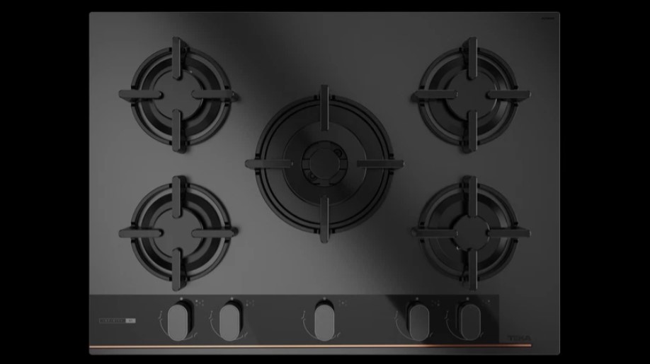 - Özel mat siyah yüzey üstünde bakır rengi detaylara sahip cam gazlı ocak
